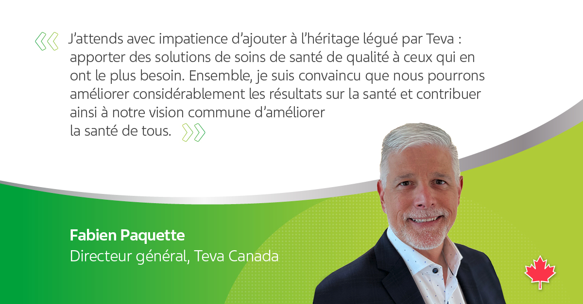 Notre nouveau directeur général compte à son actif une expérience pharmaceutique diversifiée dans de multiples champs thérapeutiques. L’arrivée de Fabien permettra à Teva Canada de poursuivre le déploiement de sa stratégie « Tournés vers la croissance » — et d’élargir ainsi nos capacités dans le secteur des médicaments innovants et biosimilaires, tout en explorant de nouvelles possibilités de renforcement de nos médicaments génériques établis. Ensemble, nous continuerons de faire porter nos efforts sur l’offre de solutions en soins de santé qui sont accessibles aux patients canadiens.